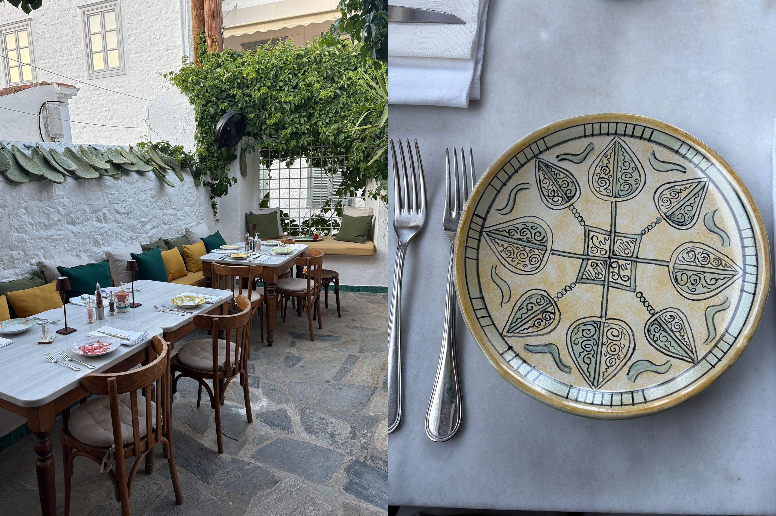 Set amongst the pine trees right on secluded beach and part of the Four Seasons Hydra, the menu is authentic Greek cuisine with a local wine list. It also follows the recipes of Anastasia “Tassia” Rampias, one of the last great cooking maidens of the island. Xeri elia Rustic and traditional, this village haunt sits beneath vibrant purple bougainvilleas with a tasting menu of authentic Greek dishes – grilled octopus xinato, keftedákia and shots of anise-flavoured aperitif. Serving plates have also been decorated by previous customers including Kate Moss and Vivienne Westwood.