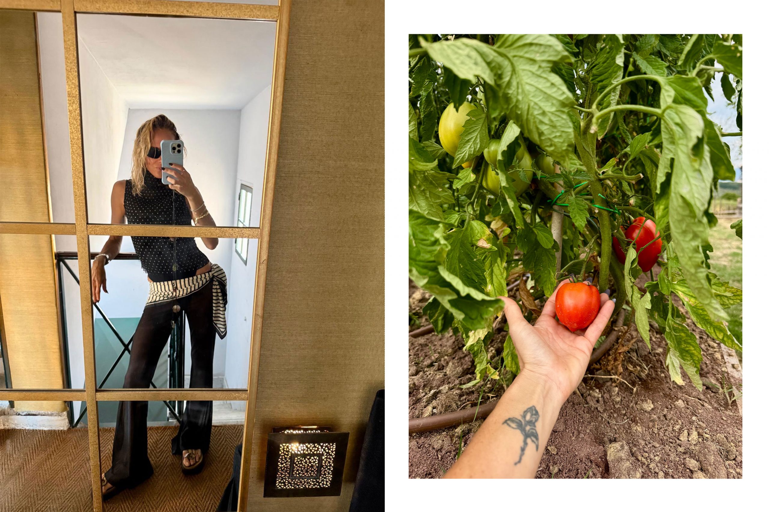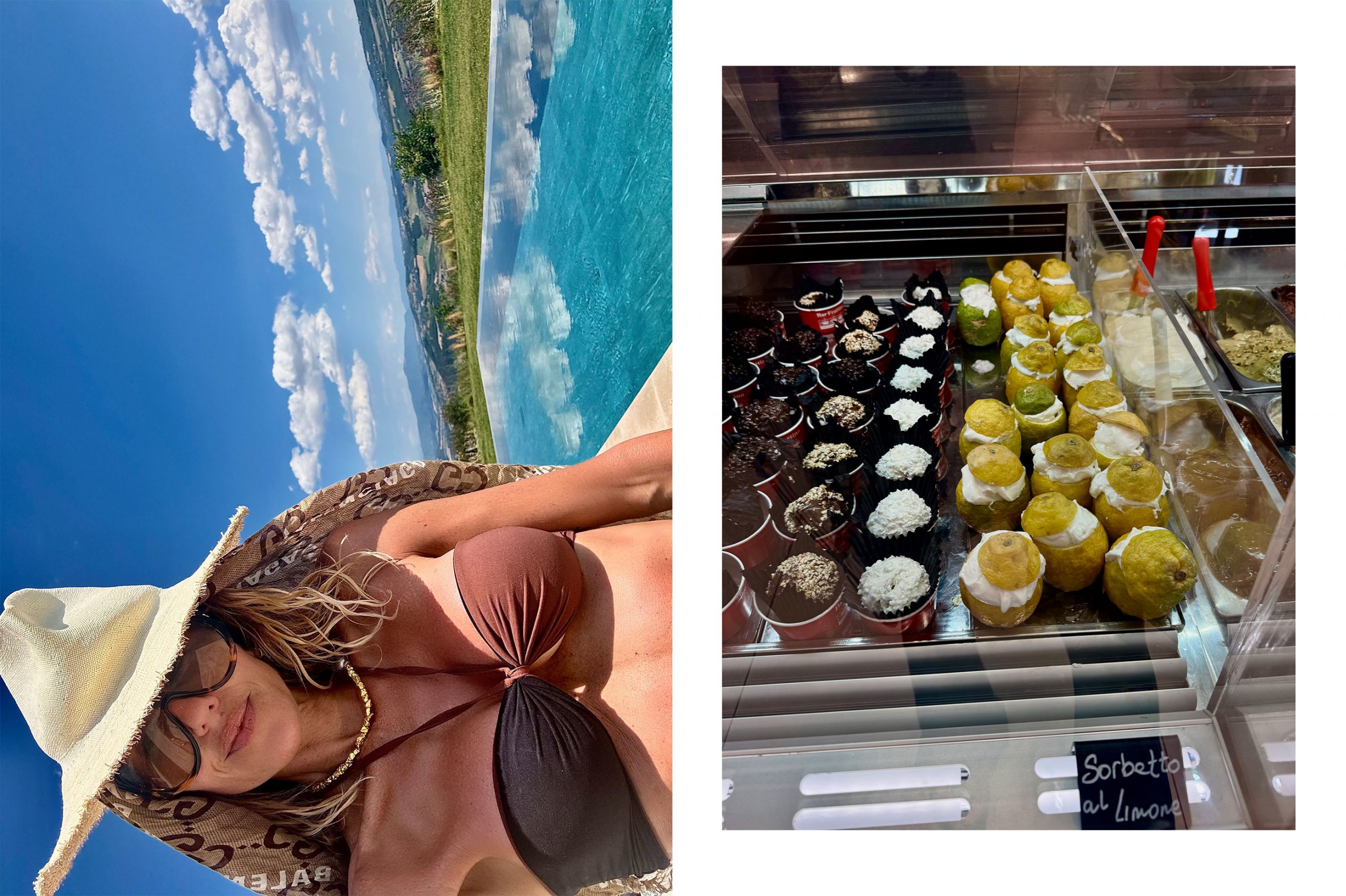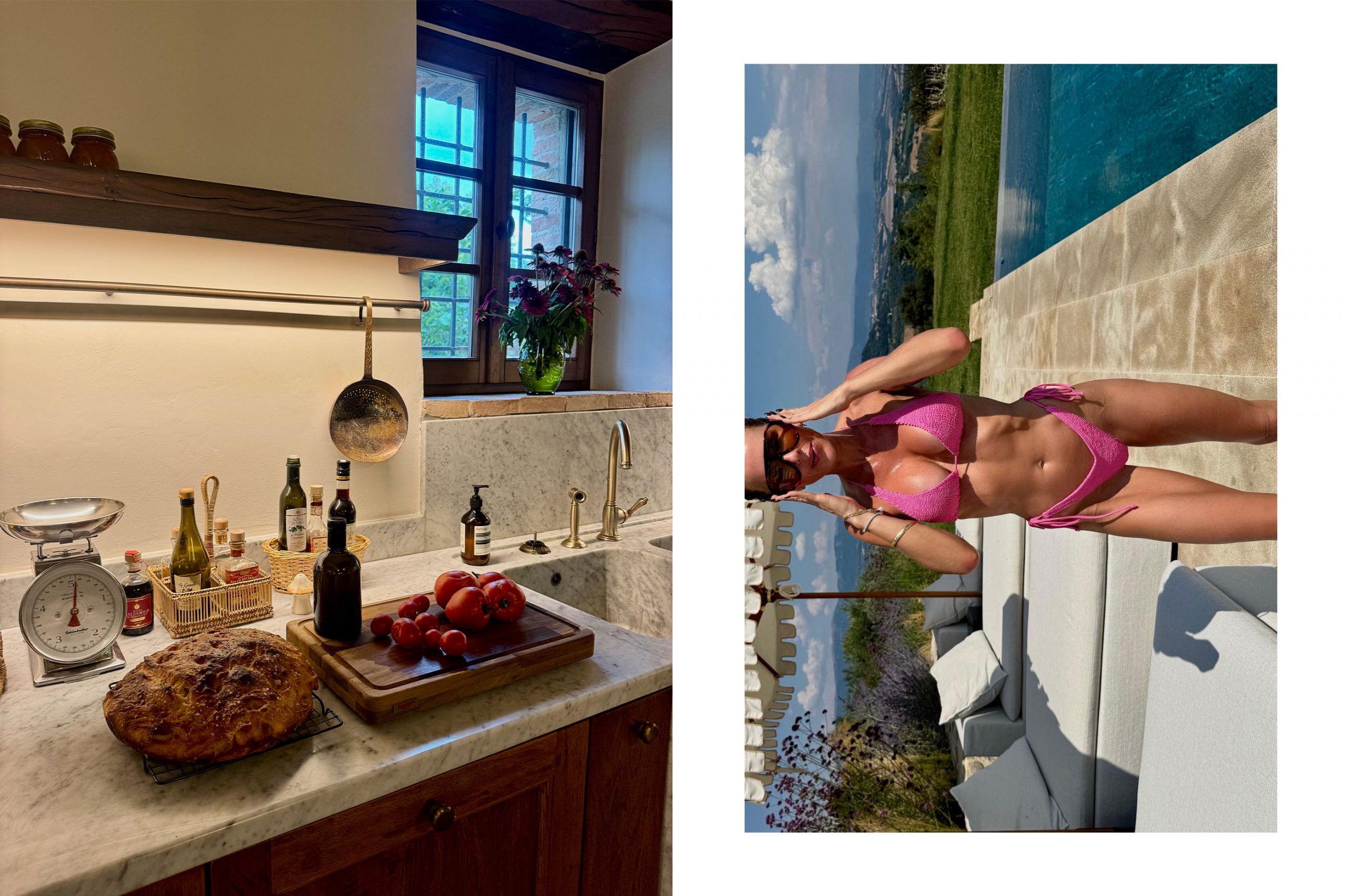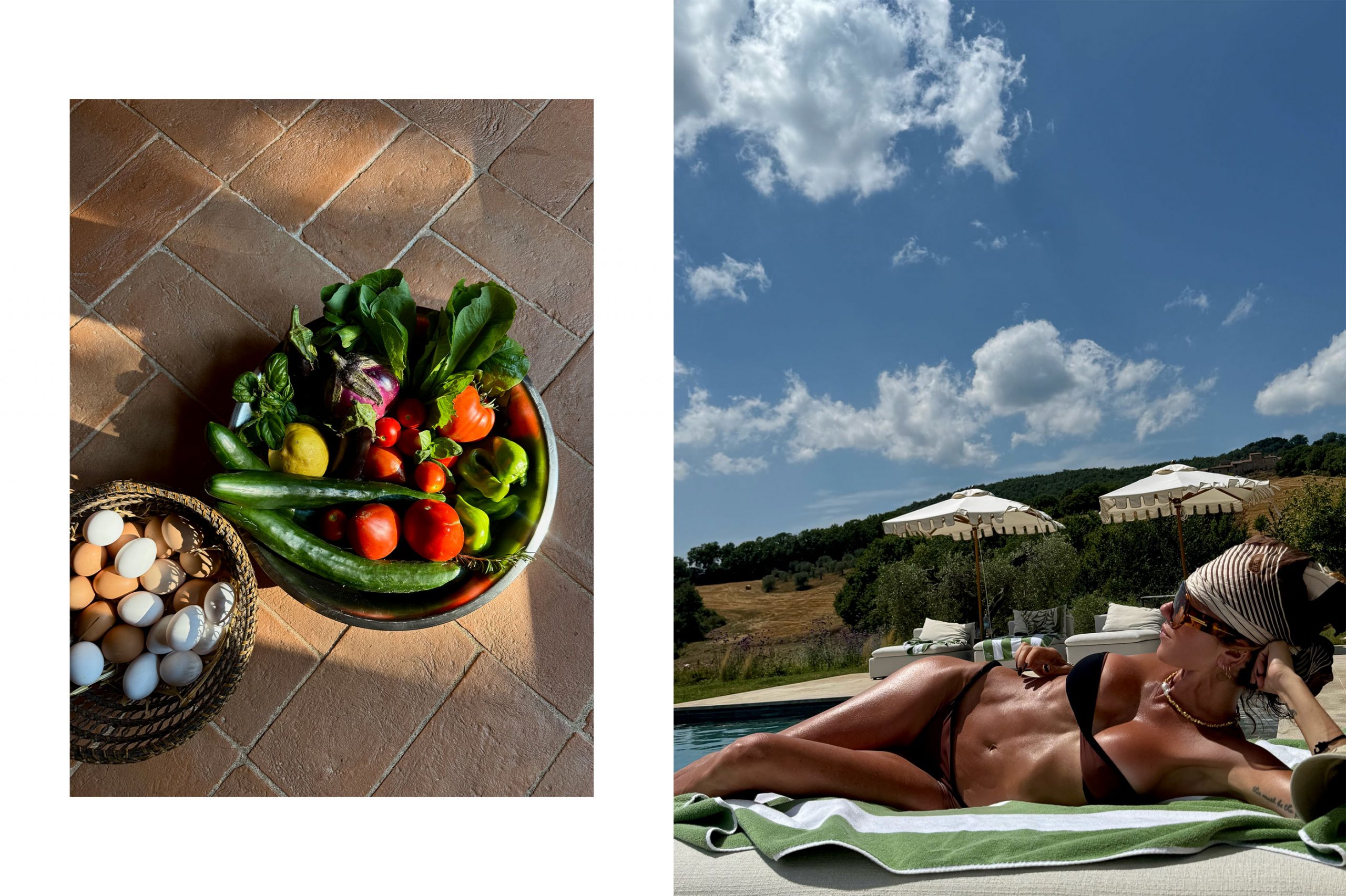 Mornings began slow. Coffee on the terrace, the kind that lingers, with light spilling over the rolling hills. The air smelled of rosemary and cypress. No rush, no calls, no deadlines – just stillness. I’d slip into a bond-eye bikini to catch the morning sun, and dive straight into the pool. There’s nothing more liberating than swimming in that early light, before the day heats up, then soaking up the Umbrian sun poolside all day.