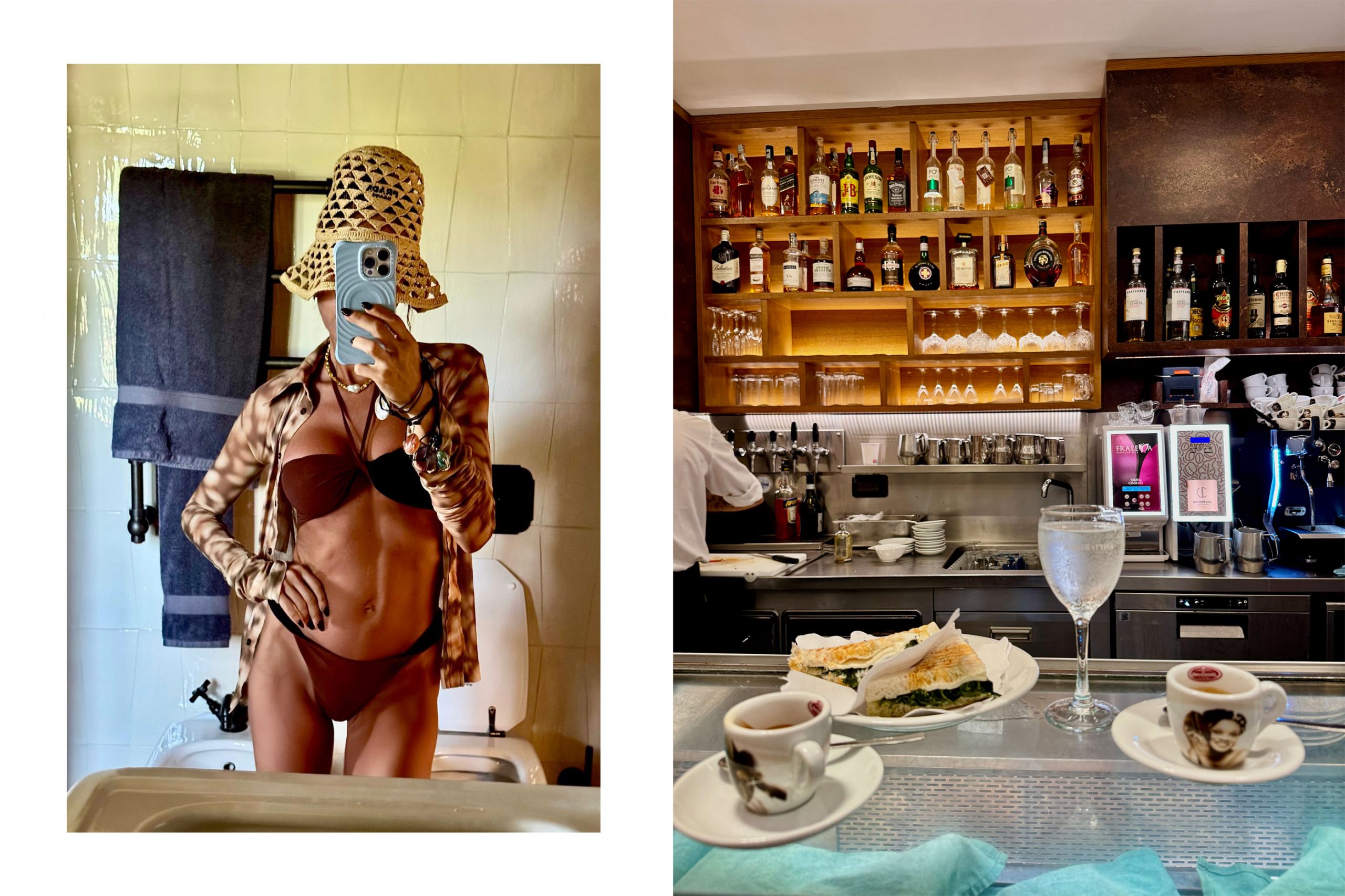 Evenings melted into golden hour swims. The pool mirrored the sky, and I floated until the light disappeared, bond-eye bikini still wet with the day’s adventures. Aperitivos followed by Negronis, olives, the hum of cicadas before wandering into town for dinner under fairy-lit piazzas (location details)