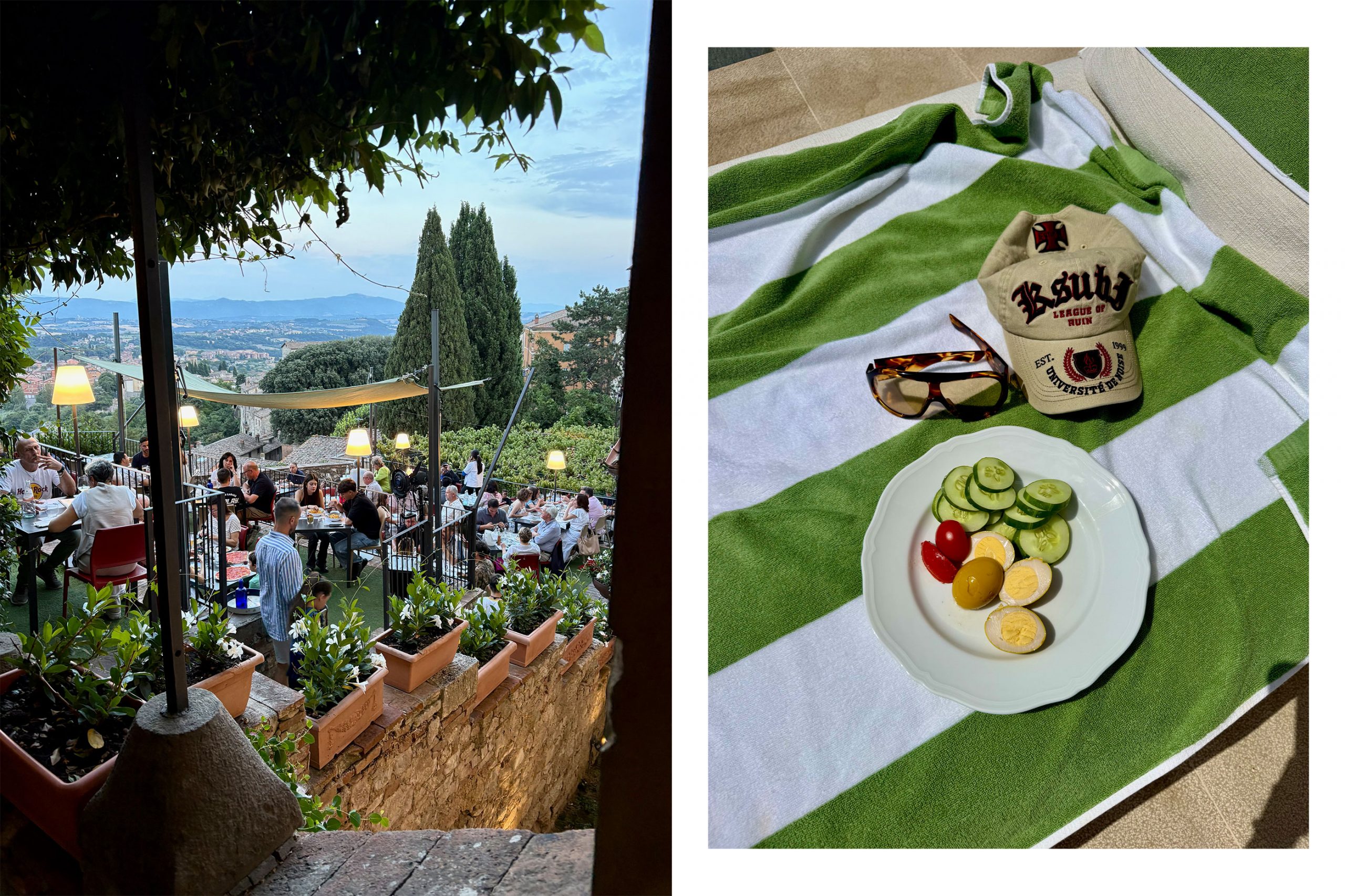 Mornings began slow. Coffee on the terrace, the kind that lingers, with light spilling over the rolling hills. The air smelled of rosemary and cypress. No rush, no calls, no deadlines – just stillness. I’d slip into a bond-eye bikini to catch the morning sun, and dive straight into the pool. There’s nothing more liberating than swimming in that early light, before the day heats up, then soaking up the Umbrian sun poolside all day.